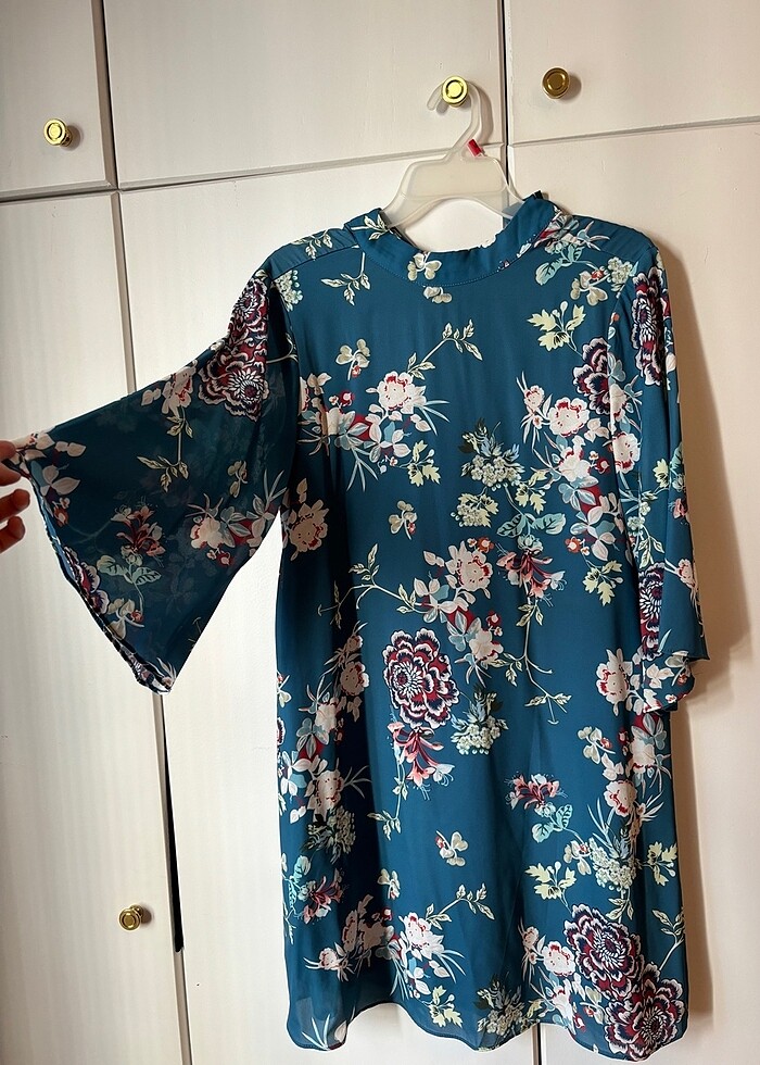 Rahat bir kalıbı var. Yakasında düğme detayları var. Sadece 1 kez giyebildim. Rengi fotoğrafta göründüğünden bir ton daha açık mavi. Hiçbir defosu yok. Diz kapağına denk geliyor hizası, benim boyun 162cm. Üstte tiril tiril çok hoş bir duruşu var. #uzunkolluelbise