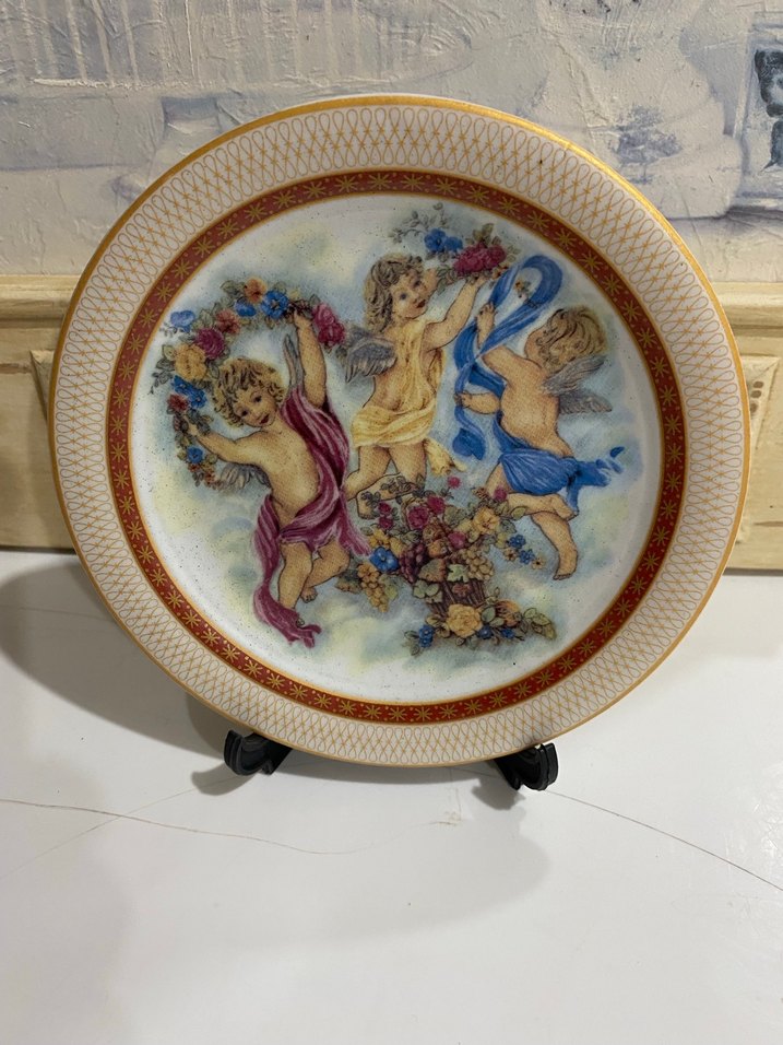 Çiçekli çelenklerle süslenmiş melek figürlerinin yer aldığı, altın ve kırmızı desenli kenarlığa sahip dekoratif tabak. Ev dekoruna klasik bir dokunuş katar.