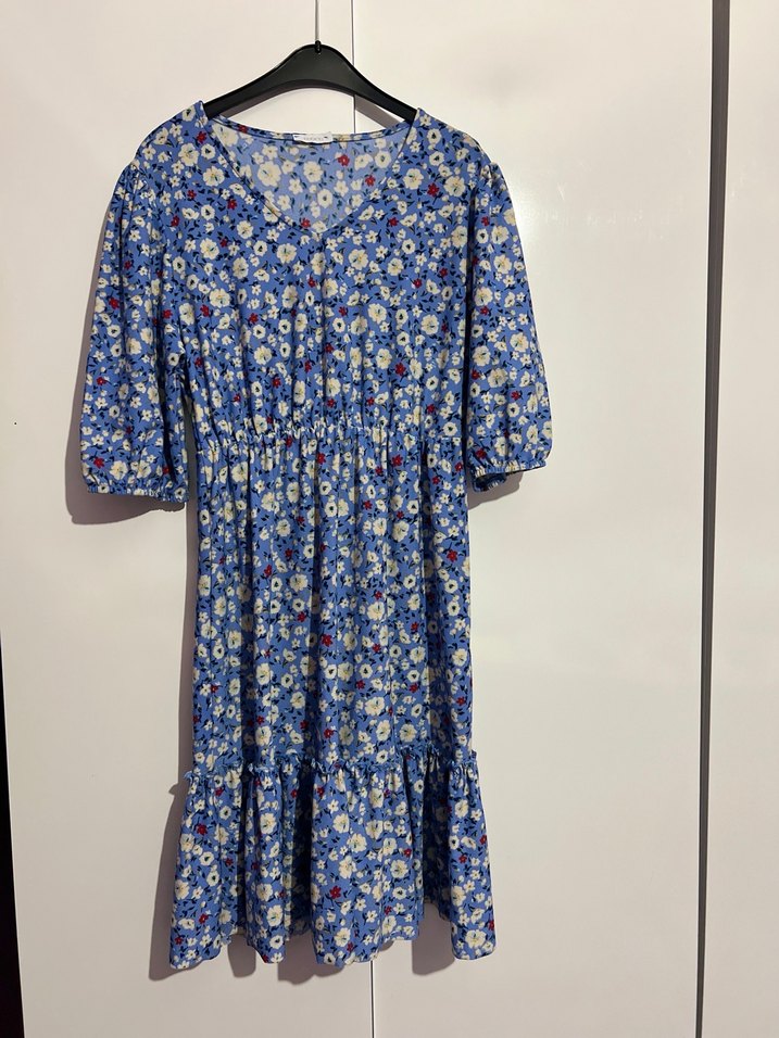 Hiç bir sorunu yoktur sayılı giyildi. Esnek yapıya sahip. Beli lastiklidir açılıyor. İki kol arası 50cm, Bel 35cm , Boy 98cm’dir. Rahat kesim, V yakalı ve kısa kollu midi boy elbise. çiçek desenli ve fırfır detaylı, günlük bohem tarz için uygun.