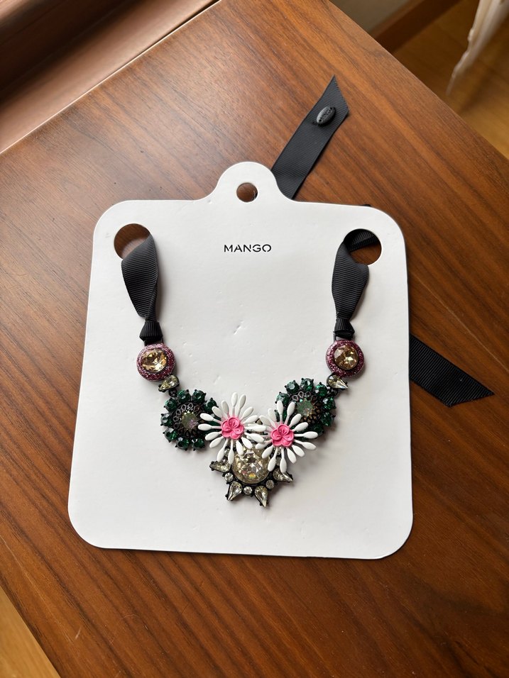 Şerit bağlamalı, boncuklu kolye çok renkli çiçek desenlerine sahip bohem tarzda, romantik akşamlar için uygun. Marka: MANGO.