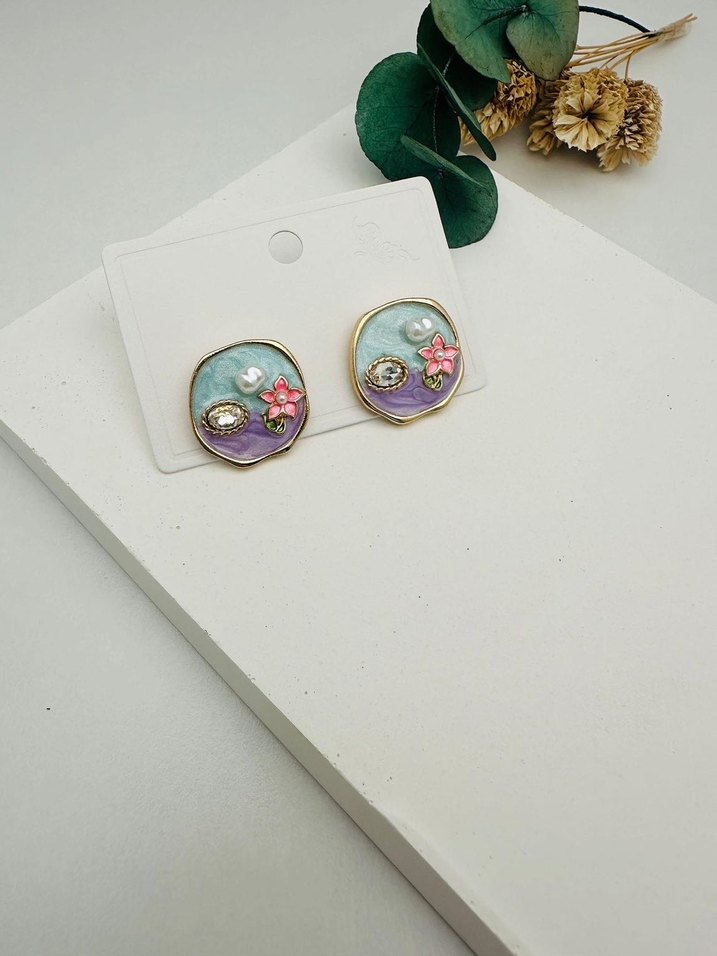 Pastel renklerde, çiçek desenli ve boncuk detaylı kısa uzunlukta kadın küpeleri, bohem stil için uygundur.
