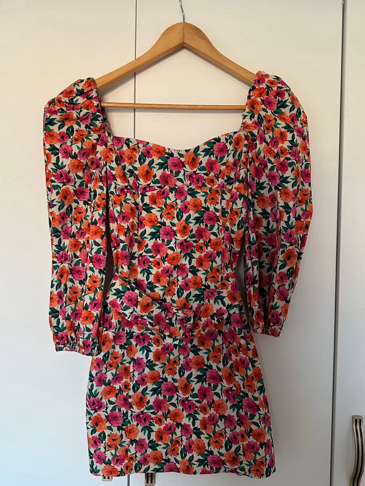Çiçekli mini elbise. Kemeri çıkarılıp takılabiliyor.