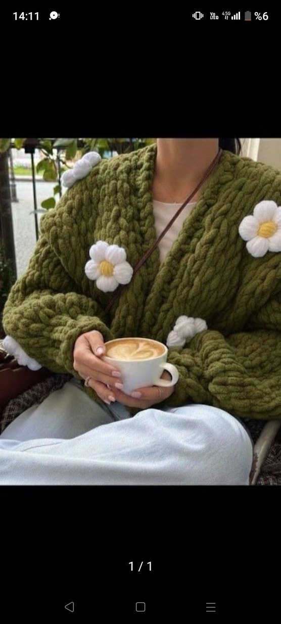 Yeşil renkli, çiçek desenli, bol kesim uzun kollu örgü bohem kadın hırka, günlük kullanıma uygun midi boyda ve bisiklet yaka.