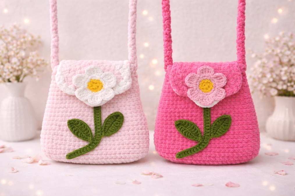 Renkli, örgü bohem tarzda kız çantaları, pembe tonlarında çiçek desenleriyle. Yumuşak dokulu, retro hippie görünümlü çiçek aplikeleri içerir.