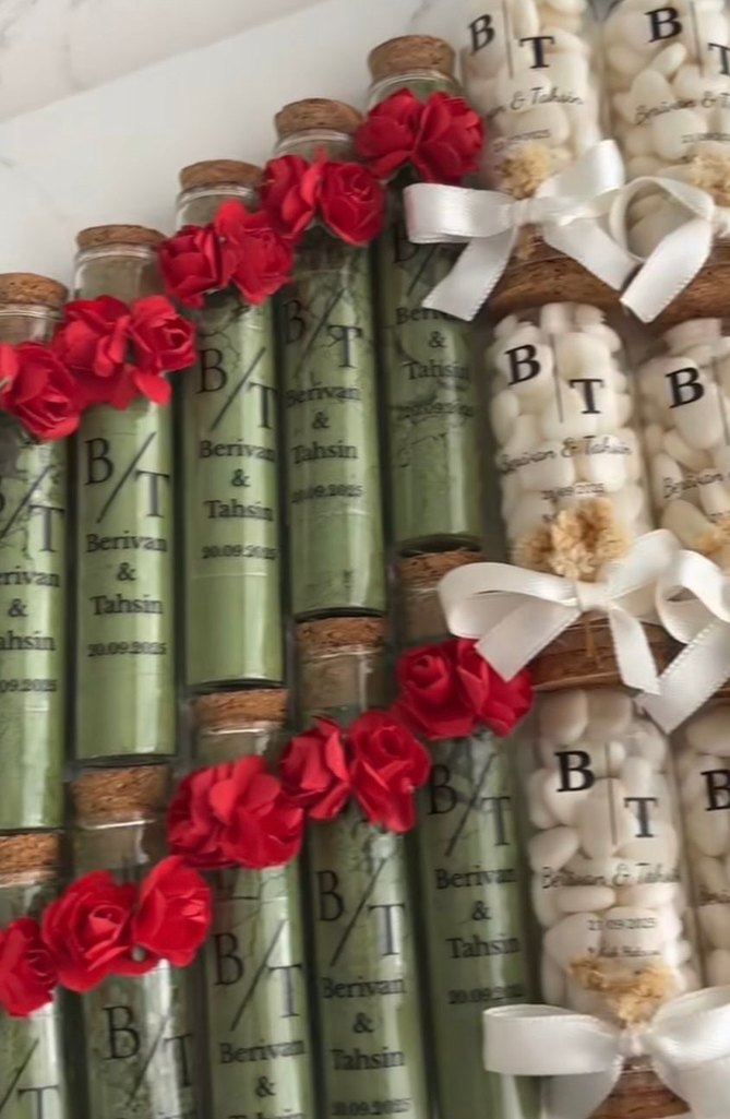İsim ve tarihle kişiselleştirilmiş, kırmızı çiçekler ve beyaz kurdelelerle süslenmiş açık bordo hediye şişeleri. Istediniz renkte, malzeme ile kişiselleştirilebilir