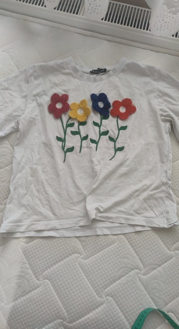 Pamuklu, beyaz, kısa kollu kız çocuk tişörtü. Önünde renkli işleme çiçekler ve yanlarda düğme detayları bulunur. Bol kesim, bohem tarzına uygun.