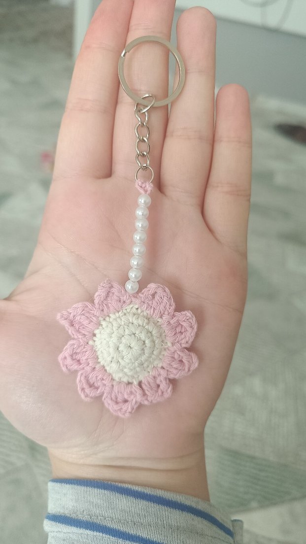 Pembe renkte, inci görünümlü boncuklu dantel çiçek tasarımlı, bohem tarzda rahat bir anahtarlık.