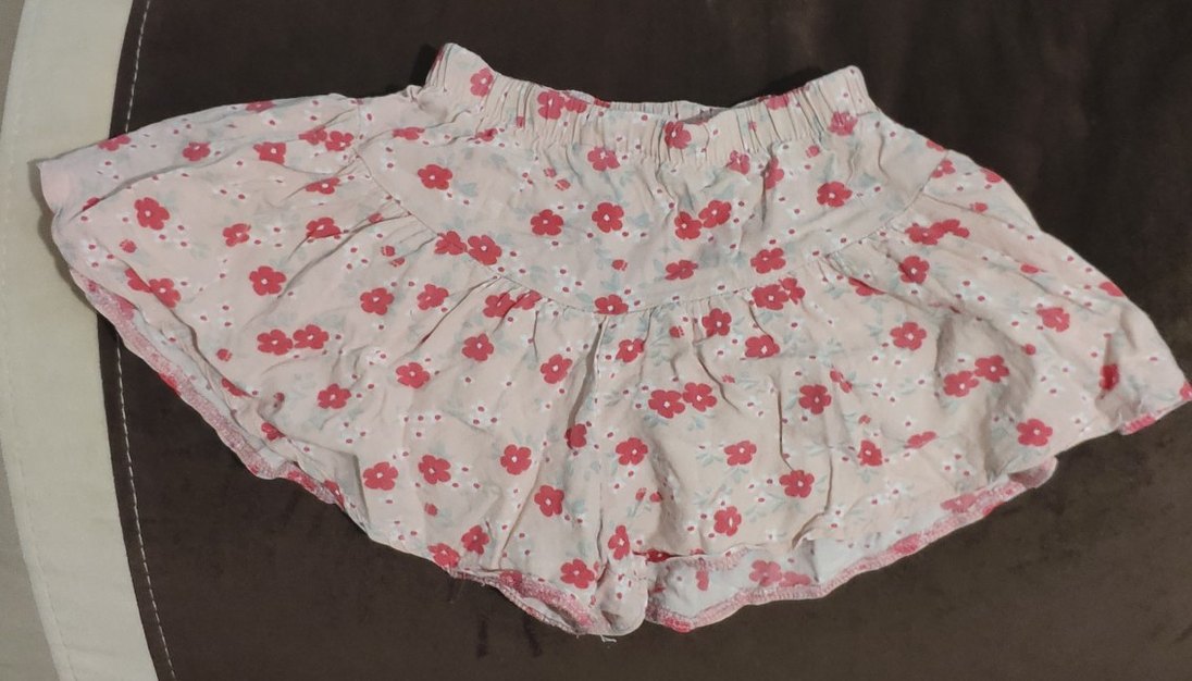 Yumuşak sentetik kumaştan, bol kesim, pastel pembe çiçek desenli ve fırfırlı kız şortu, bohem tarzda.