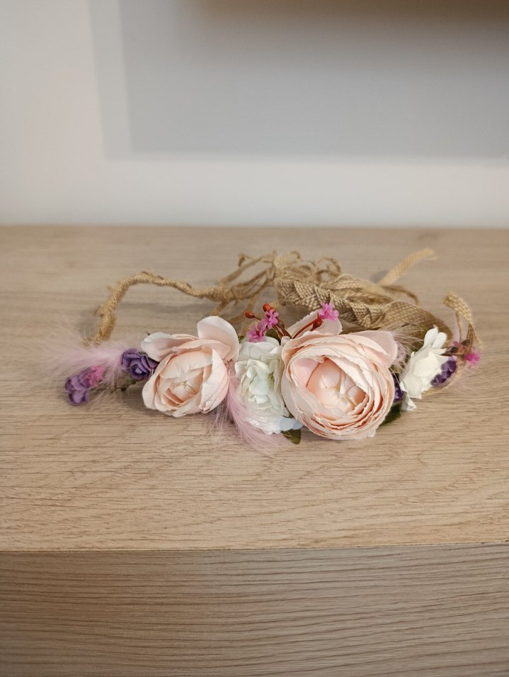 Bej renkli, dantel detaylı ve pastel tonlarda yapay çiçeklerle süslenmiş, bohem tarzına uygun örme saç aksesuarı.