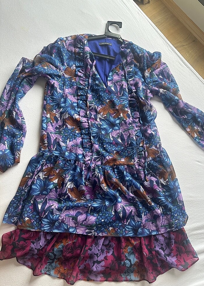 Mavi mor çiçekli şifon elbise, kolların tül içi astarlı