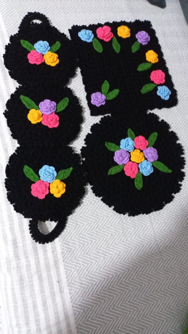 Renkli çiçek desenli ve yeşil yapraklı siyah el örgüsü lif 3 lü