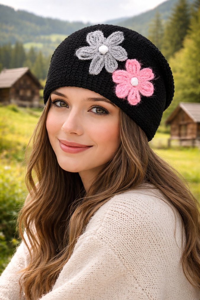 Gri ve pembe çiçek detaylı siyah örgü bere, rahat ve bohem tarzıyla retro ve hippie görünüme uygun. Sıfır ve defosuzdur.