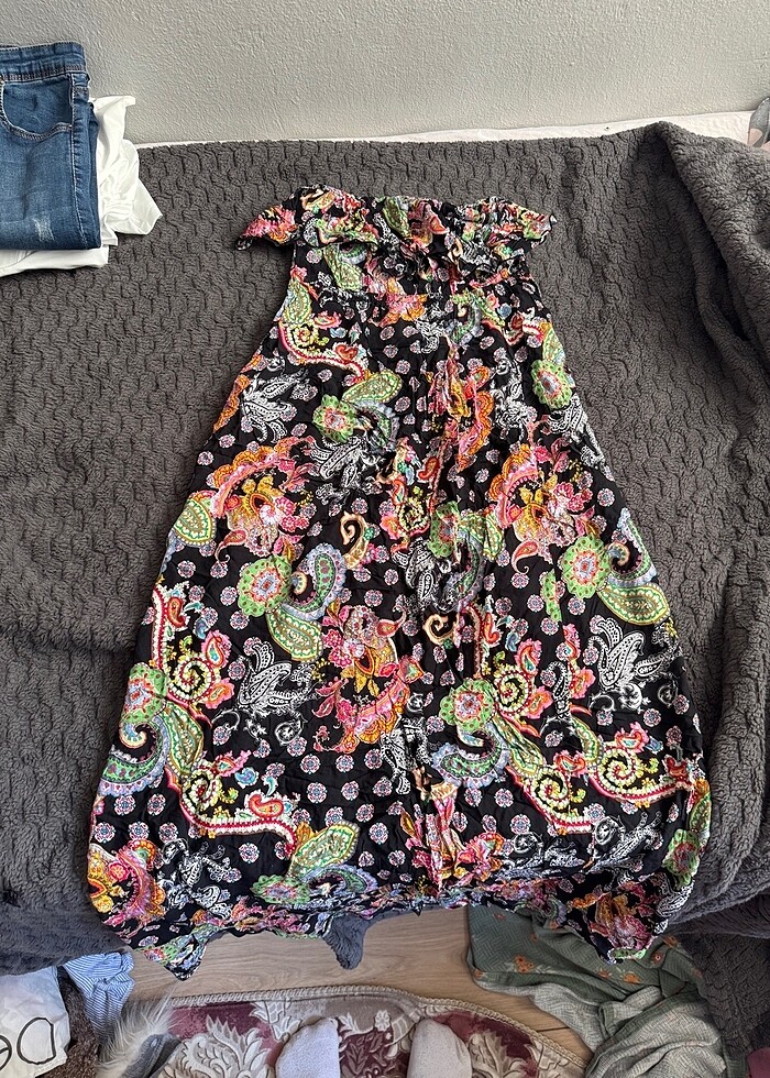 34 beden çiçekli straplez elbise çok rahat bir kumaşı var omuzlardan düşme yapmıyor markasını bilmiyorum etiketini kopartmışım rahatsız ettiği için