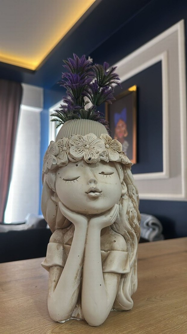 Pastel beyaz renkte, taş görünümlü çiçek tacı takmış kız figürü. Üstünde küçük bir bitki taşıyor, doğal bir hava katıyor.