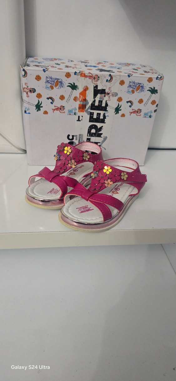 Pembe tokalı kız sandaletleri, çiçekli detaylarla süslenmiş. Kauçuk malzemeden, renkli baskılı desenli, bohem ve retro tarzda.
