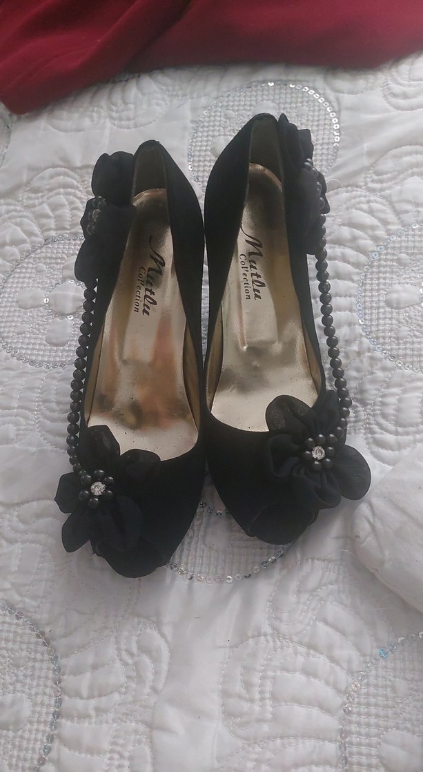 Siyah, çiçek detaylı, tokalı ve yüksek topuklu abiye ayakkabılar. Düğünler için uygun, gotik tarzda ve kauçuk malzemeden üretilmiştir.