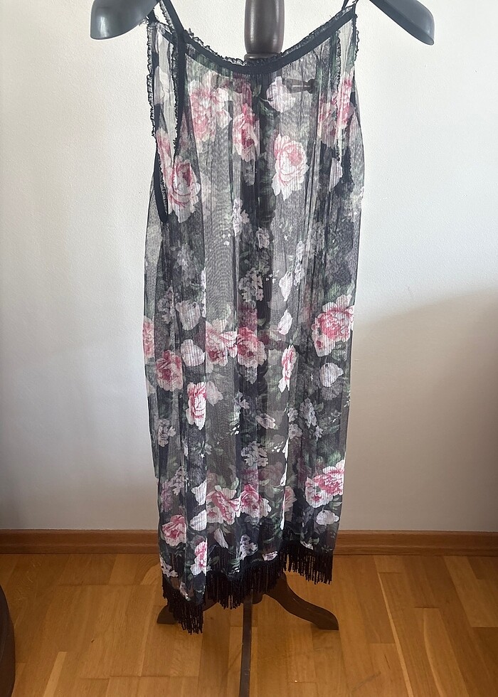 Siyah tül üzeri pembe renk gül ve yeşil renk yapraklı tek kısmı saçaklı rahat hafif bir pareo