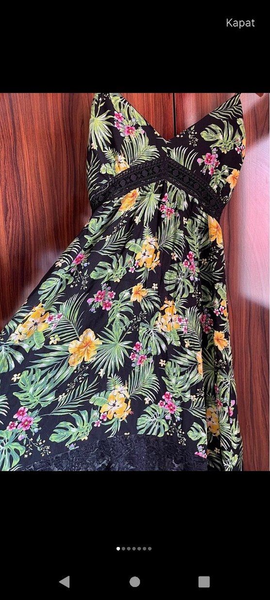Çiçek desenli, uzun ve bol kesim bohem elbise. V yaka ve dantel detaylı, ince askılı, sentetik kumaştan yapılmıştır. Romantik buluşmalar için uygundur. #elbise#gunluk #yeni