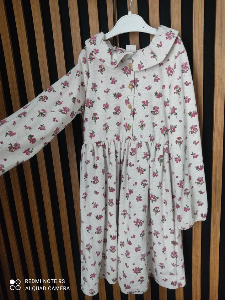 Yumuşak sentetik kumaştan, uzun kollu, yakalı ve düğmeli önü olan bol kesim bohem tarzda çiçekli kız elbisesi.