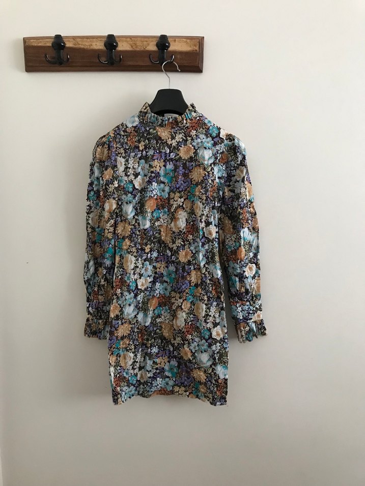 Uzun kollu, düğmeli ve yüksek yakalı, bol kesim mini elbise. Sentetik kumaştan, koyu renkli çok renkli çiçek desenli, bohem tarzda.