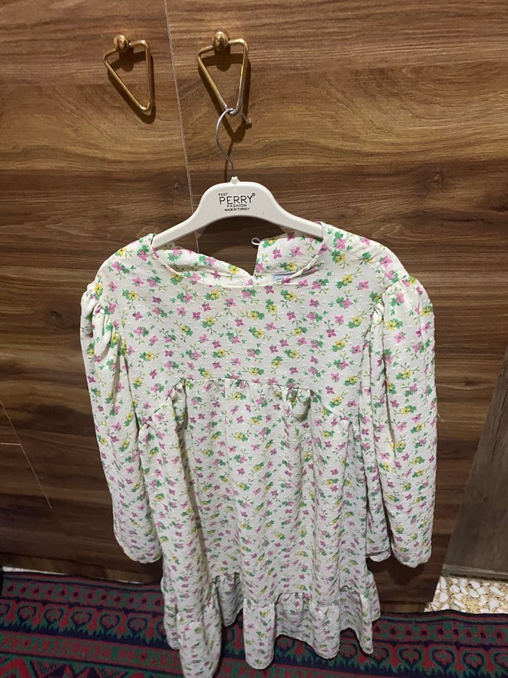 Uzun kollu, yuvarlak yaka ve fırfırlı detaylara sahip bol kesim kız elbisesi. Yumuşak sentetik kumaştan, pastel çiçek desenli.
