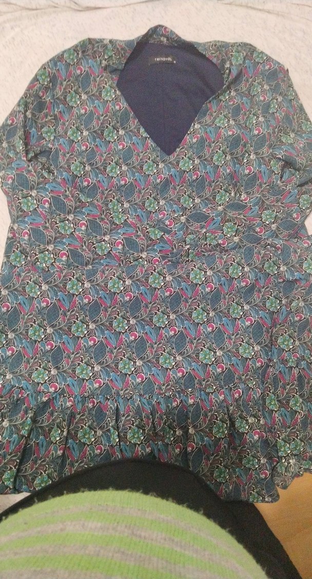 V yaka, uzun kollu, çiçek desenli ve volan detaylı bol kesim hamile tunik. Günlük kullanıma uygundur.