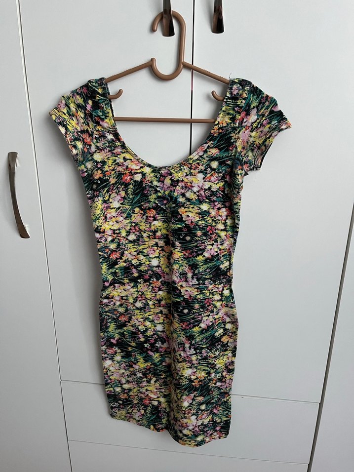V yaka, kısa kollu, çiçek desenli, midi boy, sentetik kumaştan, vücuda oturan kadın elbise. Günlük kullanım için uygun, dökümlü model .