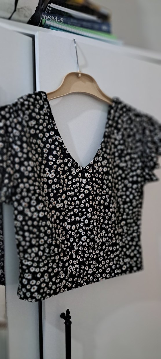 ön kısmı, V yaka ve kısa kollu siyah kadın bluz, gri çiçek desenlidir. Sentetik kumaştan yapılmış, kısa ve dar kesimdir.