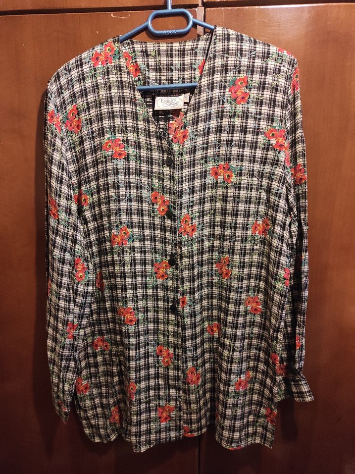 Çiçekli, retro desenli gömlek Etikette 12 yazmaktadır (40 bedene uygundur). Temiz ve iyi durumdadır.