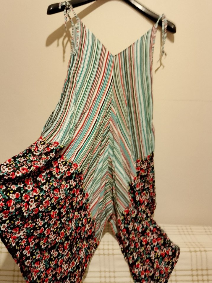 Askılı, straplez yakalı bol kesim bohem tulum. Pastel çizgili ve çiçek desenleriyle, yumuşak sentetik kumaştan günlük kullanım için uygun.