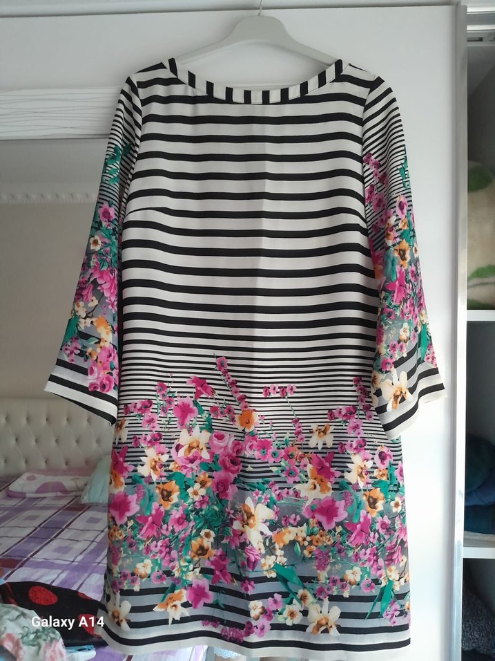 Renkli çiçek ve çizgi desenli, uzun kollu, kayık yakalı, bol kesim tunik. Sentetik kumaştan, drapeli tasarım, günlük kullanım için uygundur.