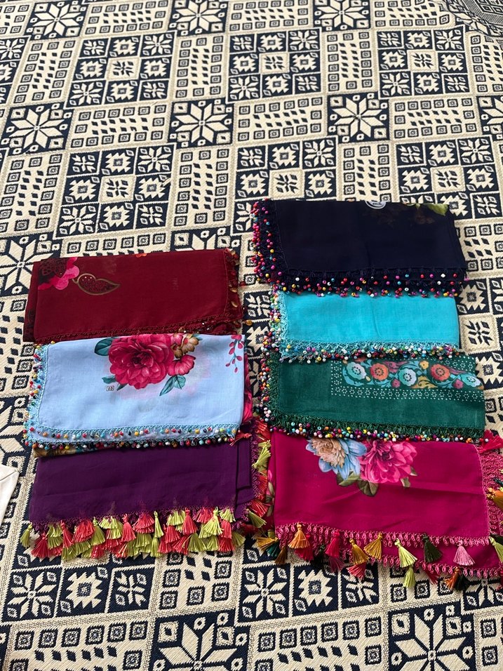 Çiçek desenli ve dantel detaylı, koyu canlı renklere sahip tekstil kadın şalları. Püskül süslemeleriyle bohem ve retro hippie tarzını yansıtıyor. Tanesı 500 tl
