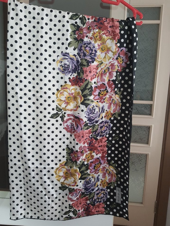 Çiçek ve puantiyeli desenli, düğmeli, çok renkli, yumuşak dokulu bohem kadın fularıdır.