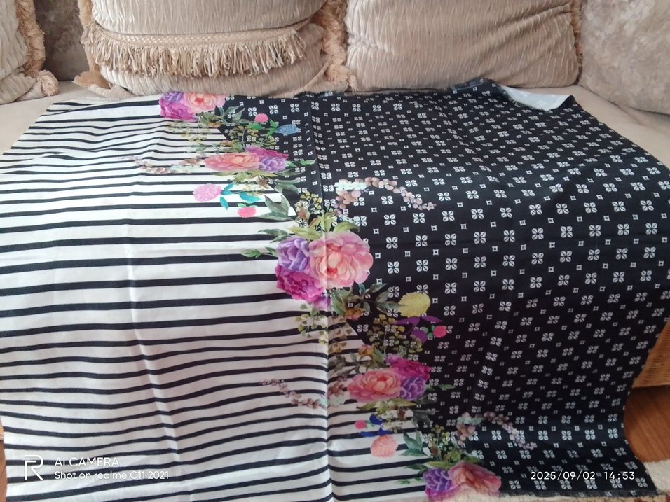 Çiçek desenli ve fırfırlı detaylara sahip koyu renkli çok renkli bohem kadın fuları, yumuşak sentetik kumaştan.