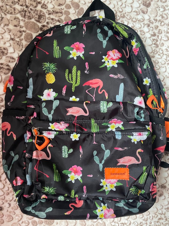 Canlı flamingo, ananas, kaktüs ve çiçek desenli renkli çocuk sırt çantası. Önde fermuarlı cep ve taşıma kulpu bulunur.
