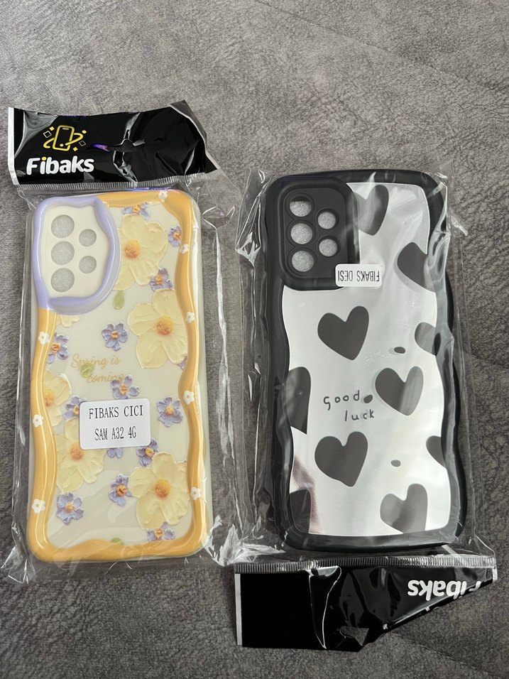 detaylı iki telefon kılıfı, çiçekli ve kalpli desenlere sahip, canlı renklerde. Üzerlerinde "Fibaks", "Soode" ve "luck" yazıları bulunur.