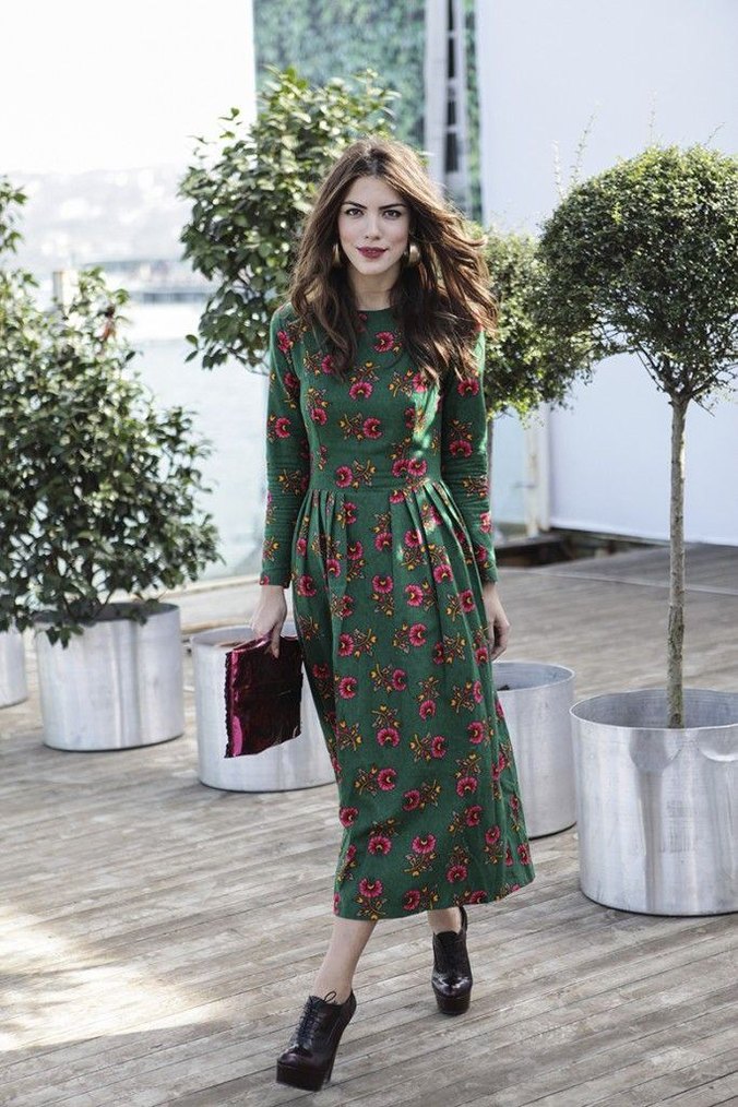 Uzun kol, pileli ve bol kesim bu haki renkli elbise, renkli çiçek desenleriyle bohem tarzı yansıtıyor. Mankenin üzerindekei elbisenin aynısıdır. Kumaşı ipek karışımlıdır. Sadece ben kollarına tadilat yaptırıp bir defa giydim ama beden değişikliğimden dolayı artık giyemem. Sıfır ayarında kusursuz bir vintage elbisedir