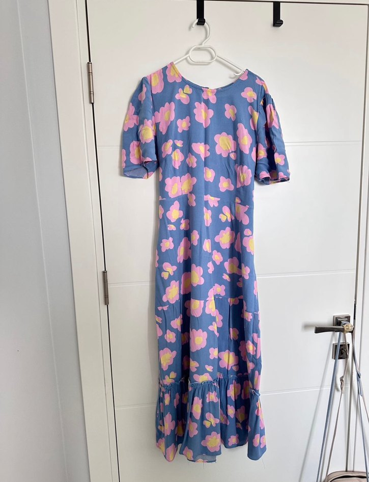 Belden oturtmalı bol kesim uzun elbise. Kısa kollu, yakası yuvarlak ve etek ucu fırfırlı. Pastel tonlarda batik desenli, bohem tarzda.