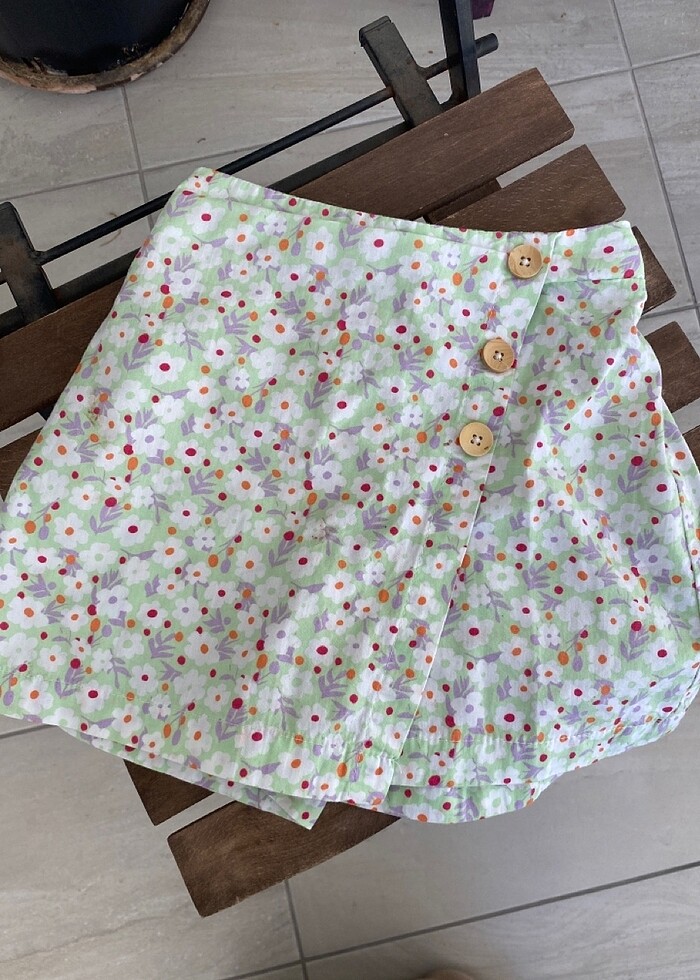 Çiçekli, beli lastikli kız çocuk şort eteği. 6-7 yaş için uygundur