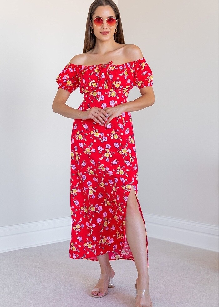 Çiçekli yırtmaç detaylı elbise