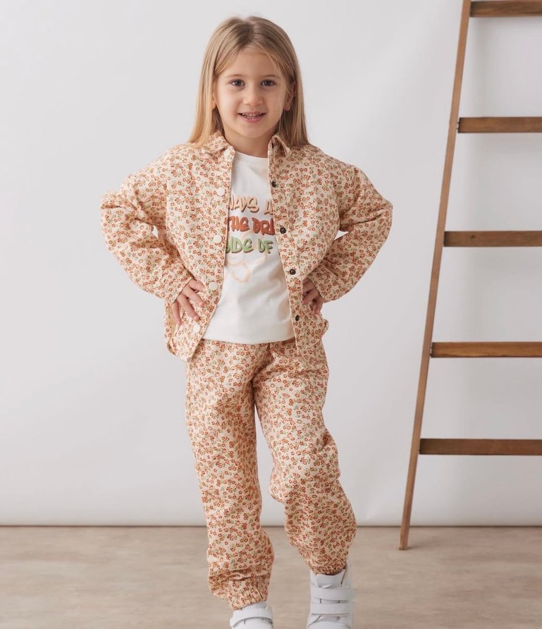 Bej renkli, çiçek desenli kız çocuk eşofman takımı. Düğmeli, yakalı ve uzun kollu üst ile uyumlu pantolonlardan oluşur. Yumuşak ve sıcak dokuda. Bel kemeride var