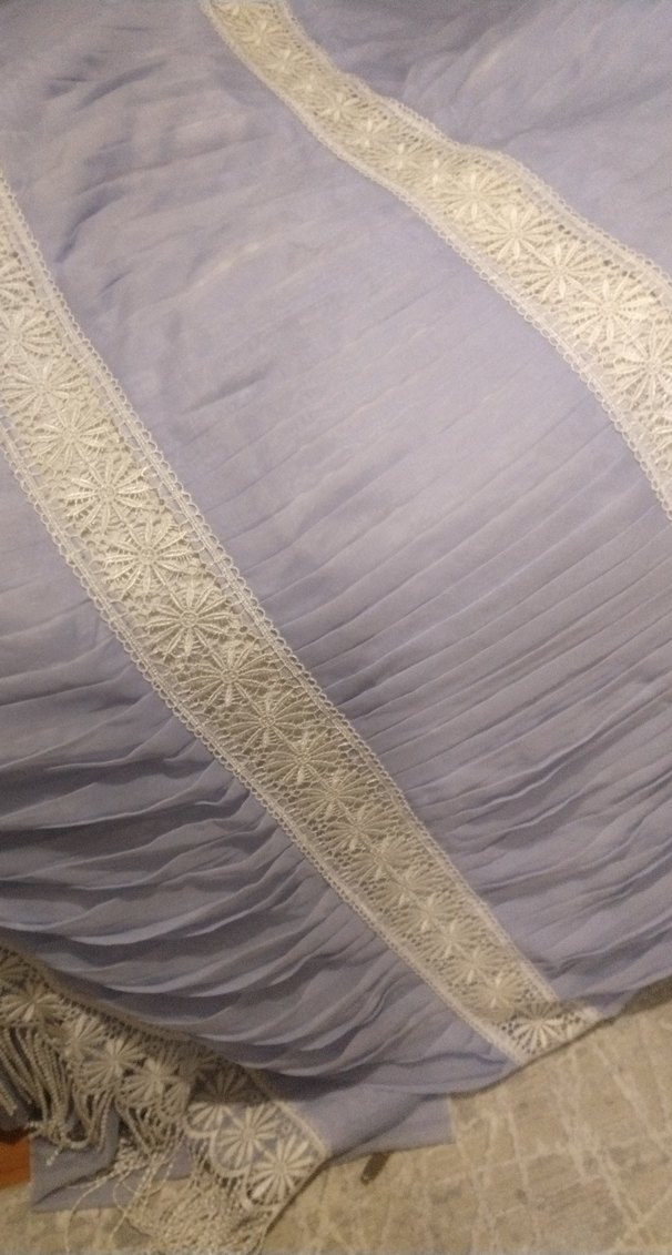 Pastel mor renkte, beyaz işlemeli çiçek desenlerine sahip çift kişilik yatak örtüsü Yumuşak dokulu ve şık tasarım. üç adet yastığı vardır hiç defermosu yoktur