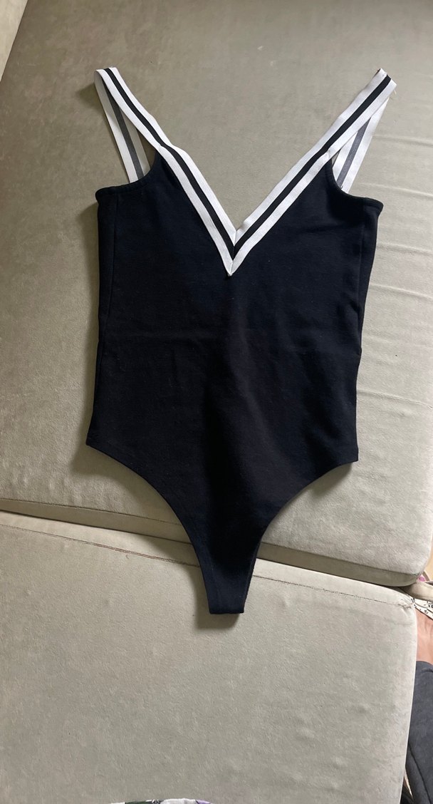 Çift askılı, V yaka kesime sahip siyah ve vücuda oturan mayo, günlük kullanım için şık ve rahat bir tarz sunar.