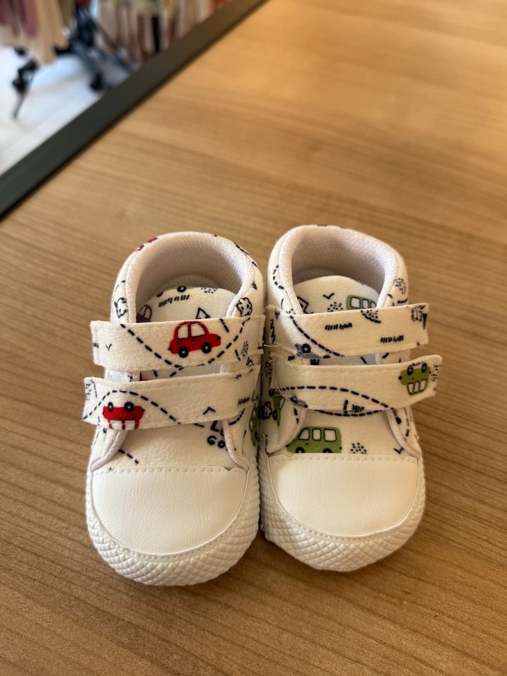 Renkli baskılı desenlere ve çift bantlı cırt cırt kapanışa sahip beyaz erkek bebek ilk adım ayakkabısı, dayanıklı kauçuk malzemeden üretilmiştir.