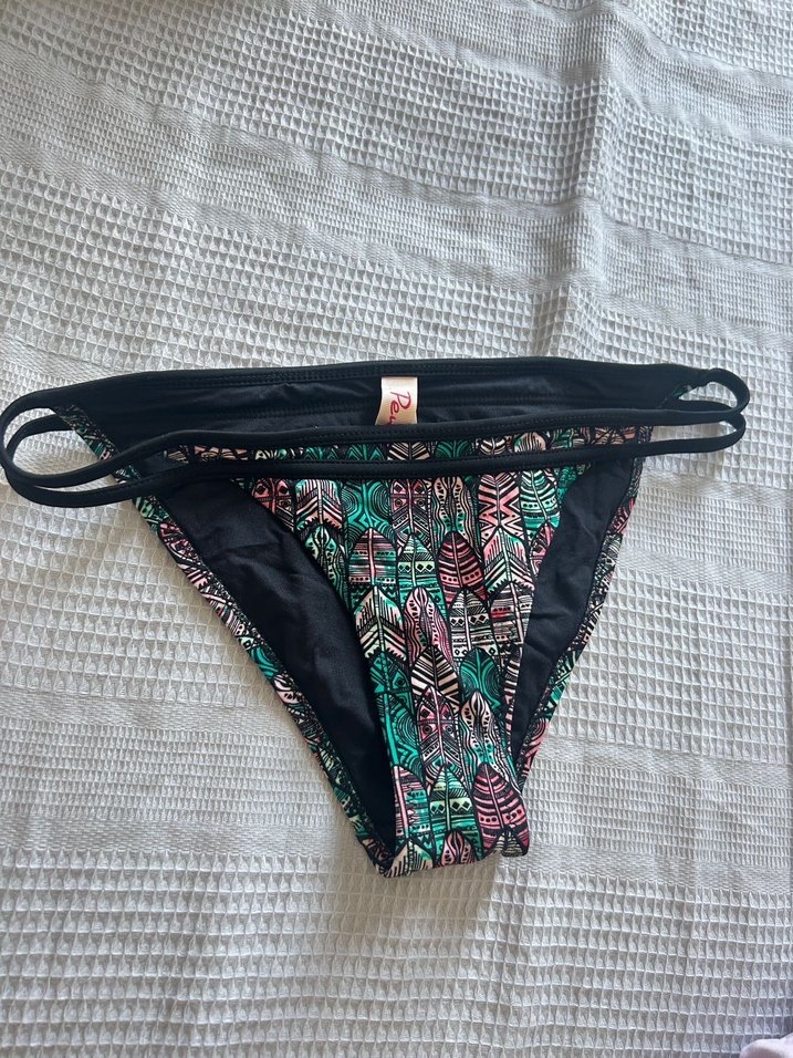 Bohem tarzda, çift bantlı, elastik yanlı, çok renkli tüy desenli ve normal boyda bikini altı.