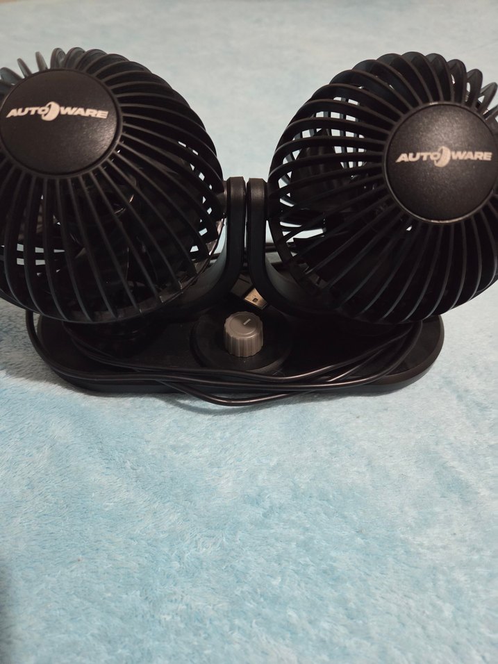 Ayarlanabilir açılı, kompakt tasarımlı siyah çift başlıklı araba vantilatör. Kontrol düğmesi ve USB kablosu bulunur. ️