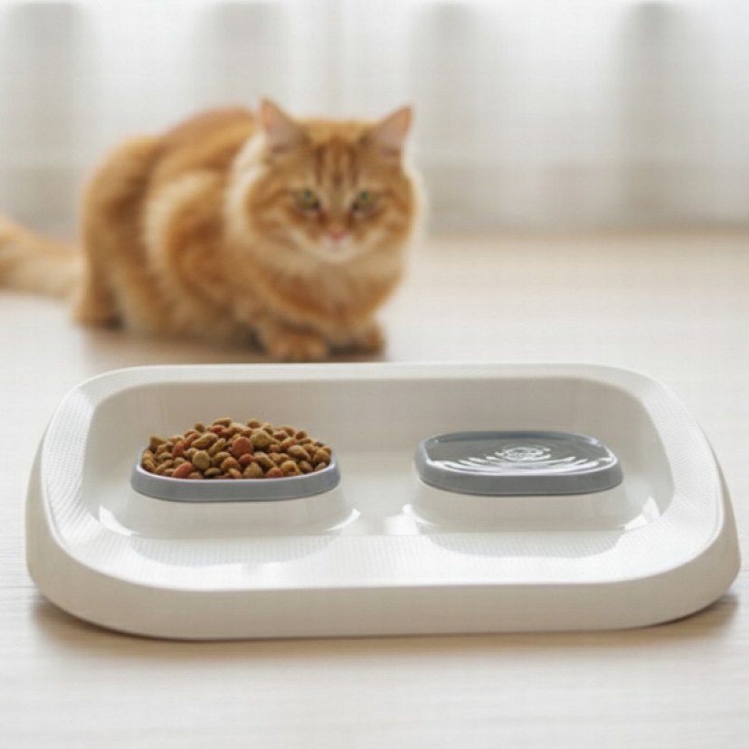 Beyaz tepsi üzerinde, bir tarafı kuru mama dolu çift bölmeli kedi mama kabı. Arka planda turuncu kedi yer alıyor.