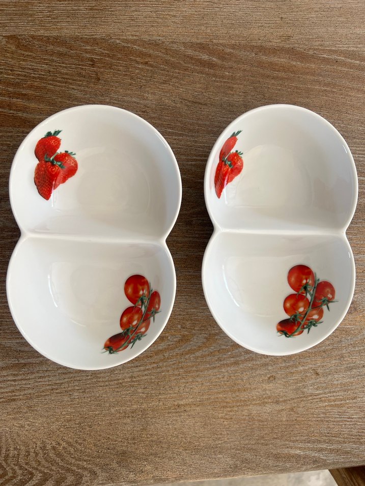 Yeni sıfır ürün. İki bölmeli beyaz tabaklar, her iki tarafında kırmızı kiraz domates desenleri bulunur, atıştırmalıklar ve soslar için uygundur.