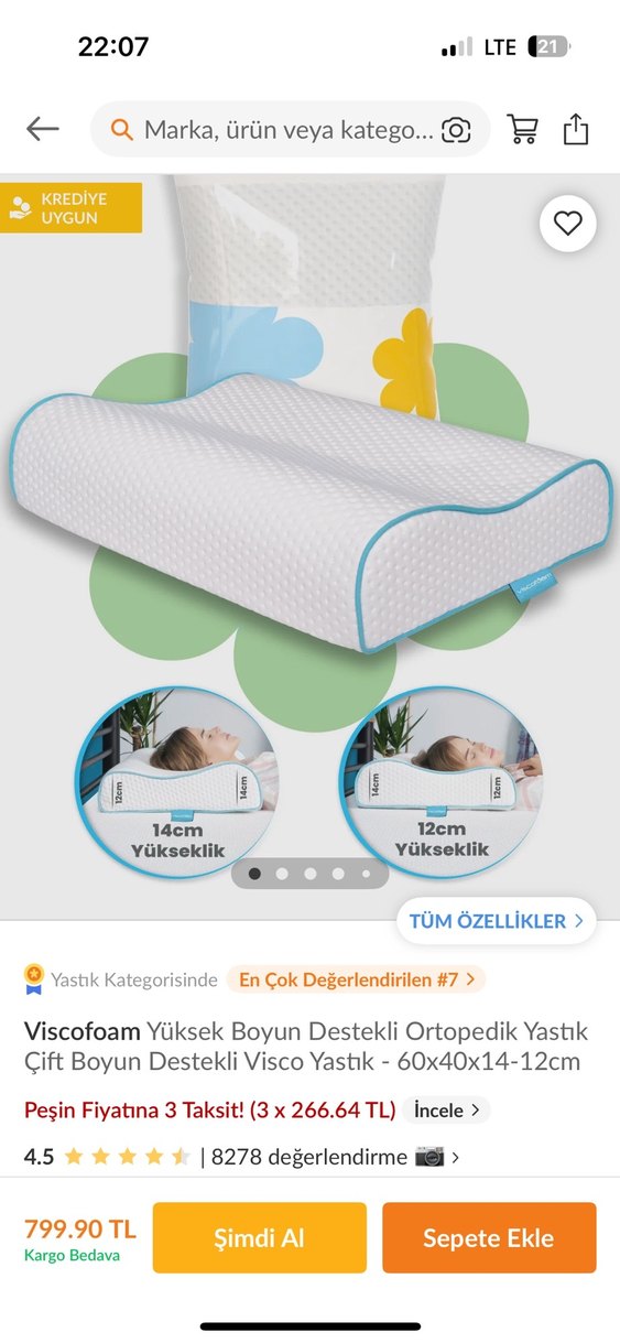 Çift boyun destekli viscofoam ortopedik yastık, 12cm ve 14cm yükseklik seçenekleriyle ergonomik konfor sağlar. Ölçüleri 60x40x14-12cm, beyaz kılıflıdır. ️