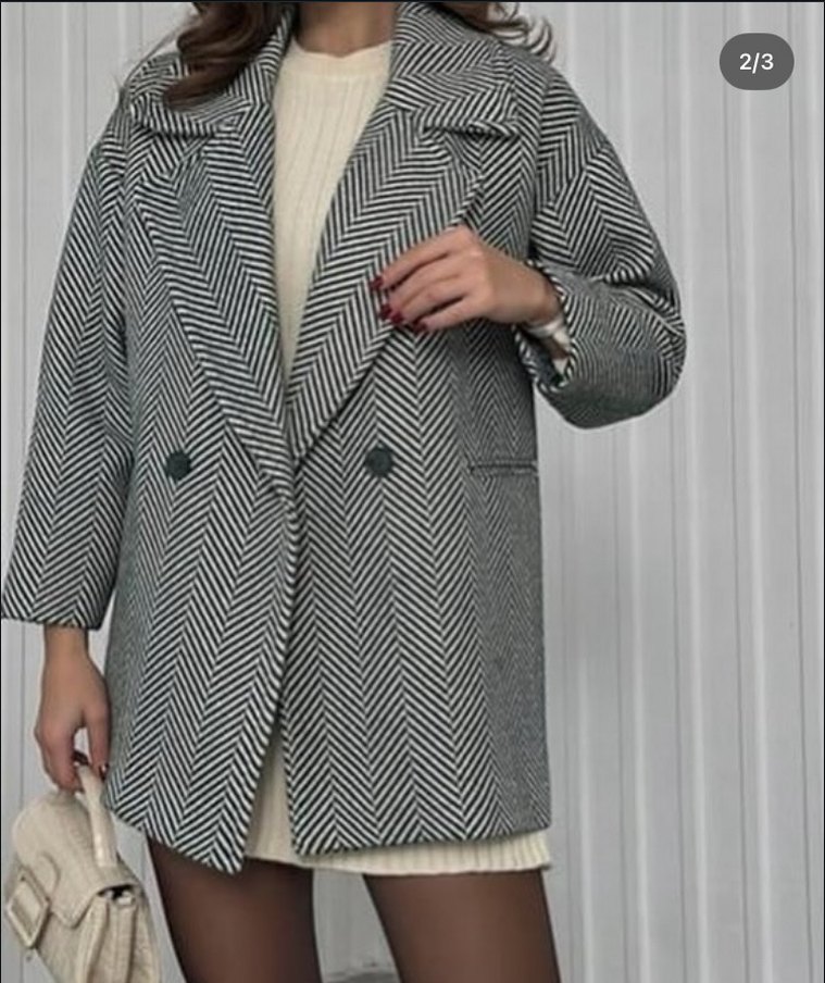 Çift düğmeli, balıksırtı desenli kaban. Geniş yaka ve ön cepler içerir, triko üzerine giyilmeye uygundur.